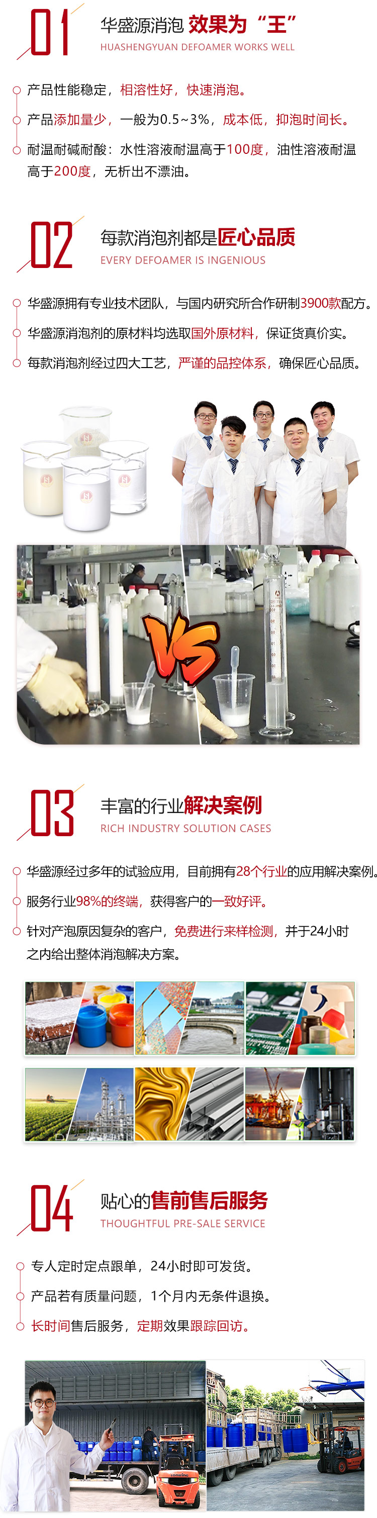 華盛源一直奉行“品行天下,質為消泡”的企業理念,從原材料選取到最后的出品,確保每款消泡劑的匠心品質,且在技術上突破傳統消泡劑行業。